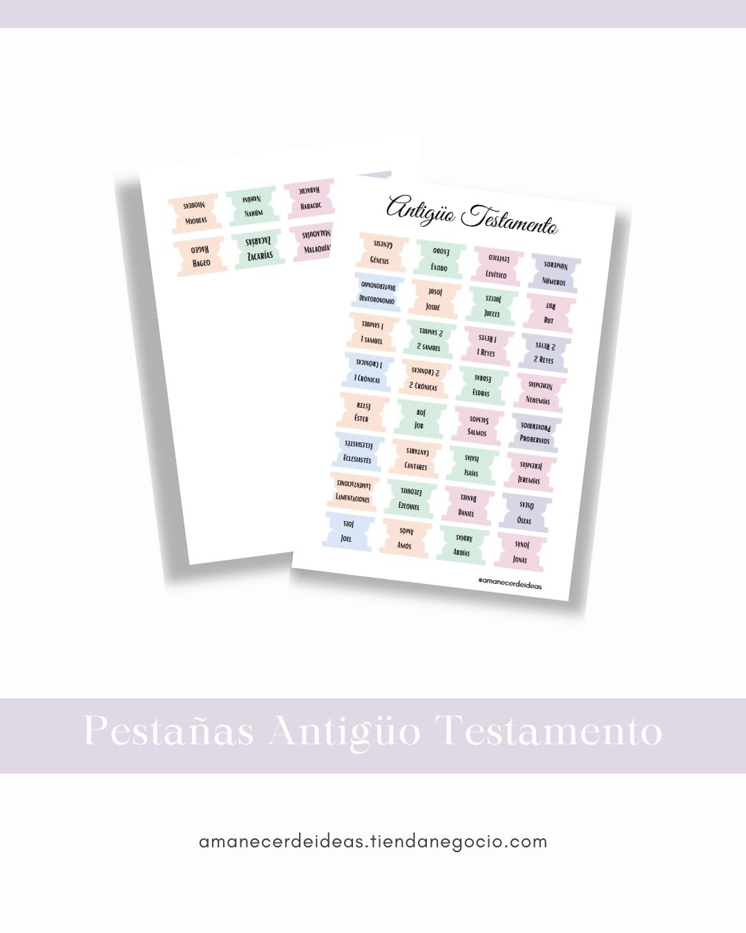 Facilita tu estudio y lectura con nuestras pestañas imprimibles para el Antiguo Testamento de la Biblia Reina Valera 1960. Diseñadas en hermosos tonos pastel, te permitirán encontrar cada libro rápidamente y darle un toque especial a tu Biblia.