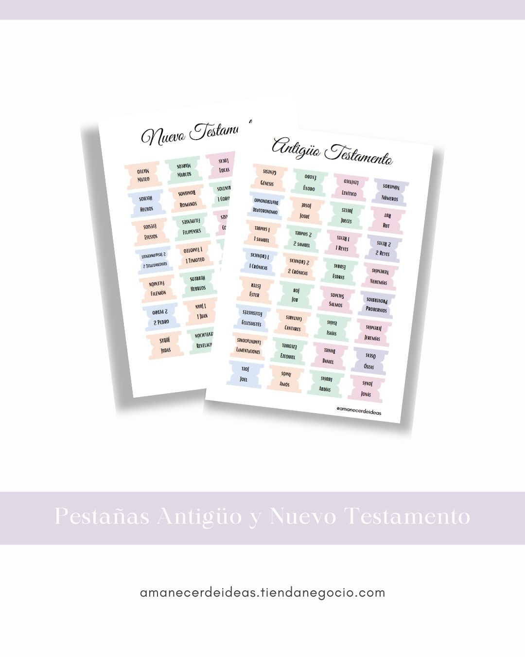Organiza tu Biblia de manera práctica y hermosa con nuestras pestañas imprimibles para el Antiguo y Nuevo Testamento de la Biblia Reina Valera 1960. Diseñadas en suaves tonos pastel, te permitirán encontrar cada libro rápidamente y personalizar tu estudio bÃblico con un toque especial.